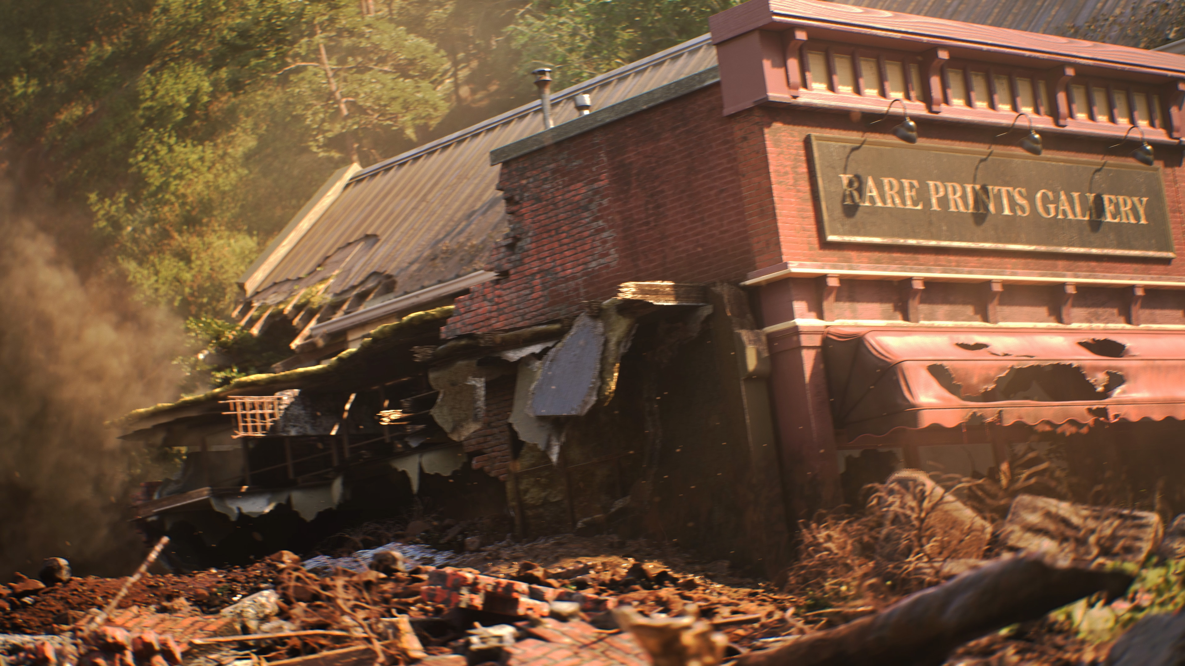 -Post-production animation shots of post-landslide destroyed town environment